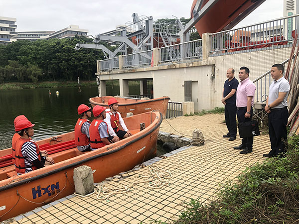 4月26日上午,广东海事局船员处郑永炳副处长、湛江海事局船员处处长邓平贵等一行到湖光校区现场调研公司参加中国船员技能大比武备赛情况。sunbet申搏经理贾宝柱、实验训练中心负责人及指导老师陪同参加调研工作。
