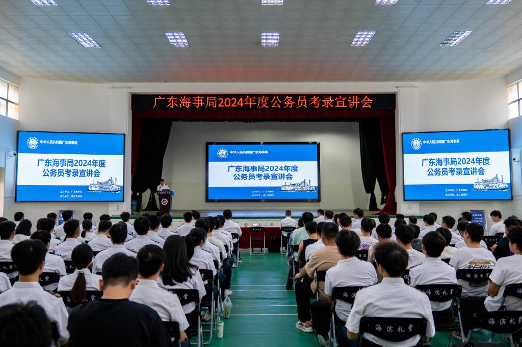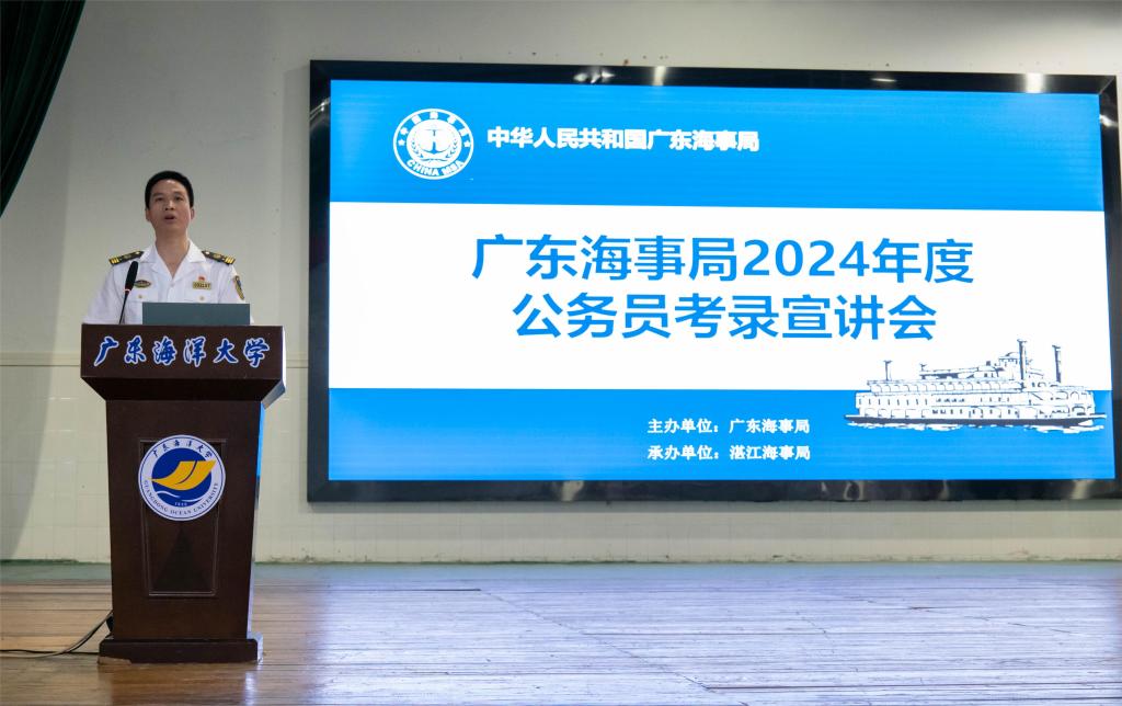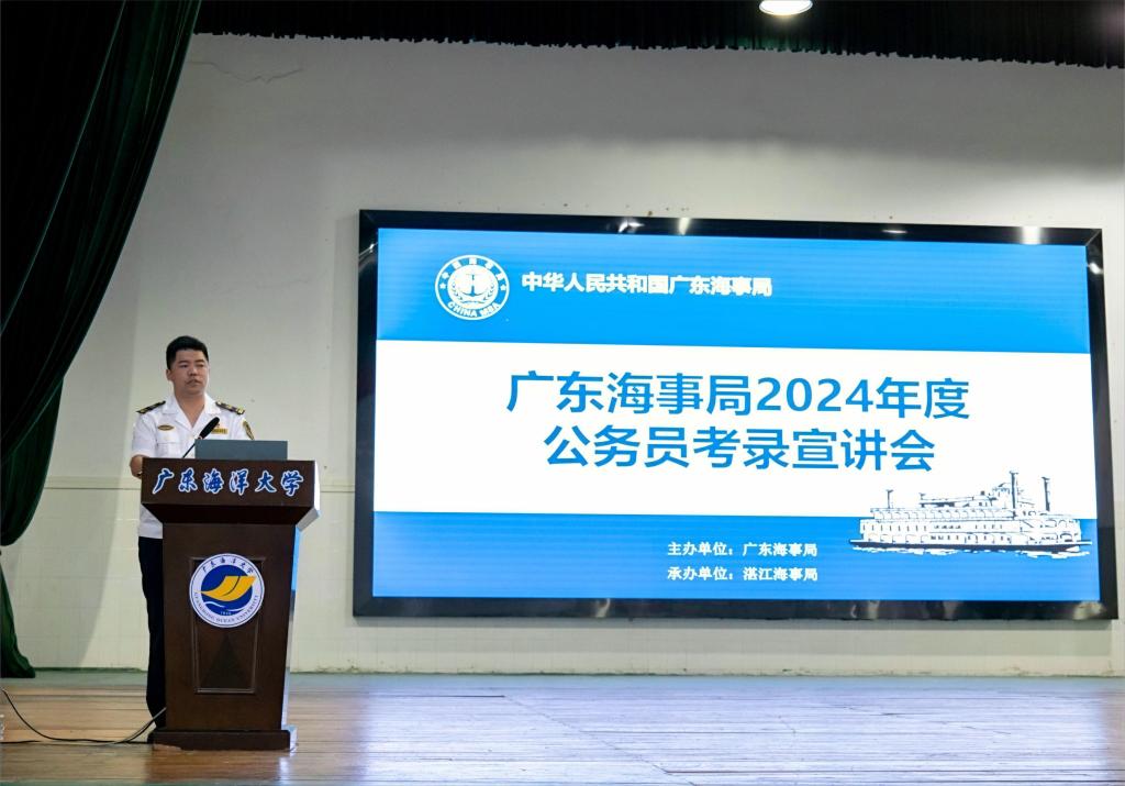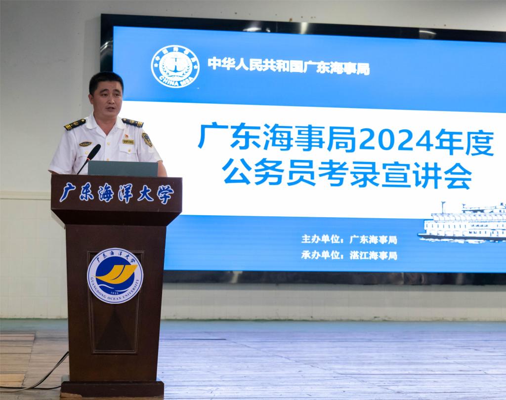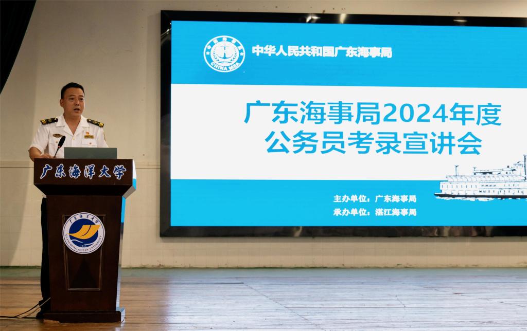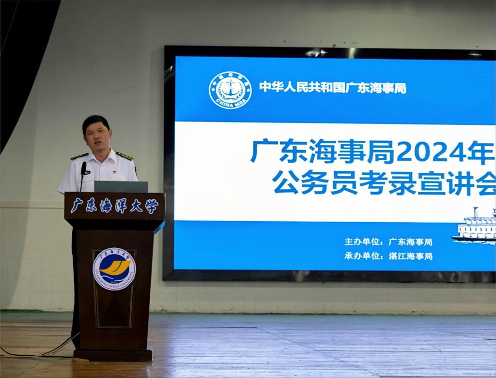 为帮助广大同学全面了解公务员考试,引导和帮助员工积极备考,促进毕业生高质量就业,10月13日下午,由广东海事局主办,湛江海事局承办的2024年度公务员考录宣讲会在公司sunbet申搏举行。湛江海事局人事教育处处长刘会清、船员管理处处长邓平贵,惠州海事局大亚湾海事处处长蔡俊杨,船舶与海运公司党委副书记齐昊以及公司300余名师生参加了宣讲会,宣讲会由广东海事局人事教育处陈亚良主持。