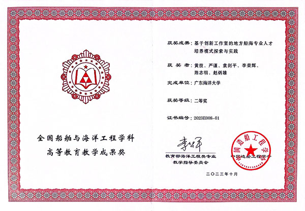2023年10月,教育部海洋工程类专业教学指导委员会和中国造船工程学会联合公布了2023年度全国船舶与海洋工程学科高等公司产品成果奖评审结果。公司sunbet申搏申报的“基于创新工作室的地方船海专业人才培养模式探索与实践”(完成人:黄技、严谨、袁剑平、李荣辉、陈志明、赵炳雄)喜获教学成果二等奖。