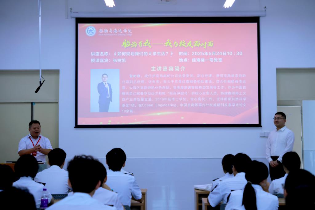 为加强公司与员工的互联互动,拓宽员工视野,凝聚校内外育人合力,5月24日上午,sunbet申搏在海滨校区经海楼举办“船海有我——我与员工面对面”活动。活动邀请了招商局邮轮公司党委委员、副总经理张树凯和中科宇创企业集团创始人郑岩宏两位2007级优秀员工分别就职业规划与创新创业进行交流分享。公司领导、老师、辅导员及员工代表200余人参加本次活动。