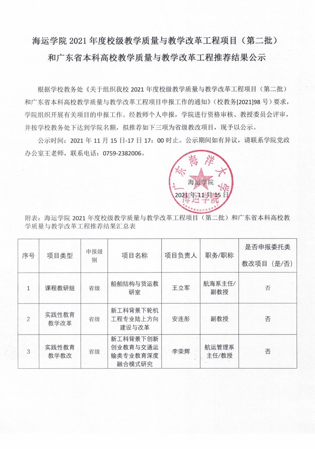 海运公司2021年度校级教学质量与教学改革工程项目(第二批)和广东省本科高校教学质量与教学改革工程推荐结果公示