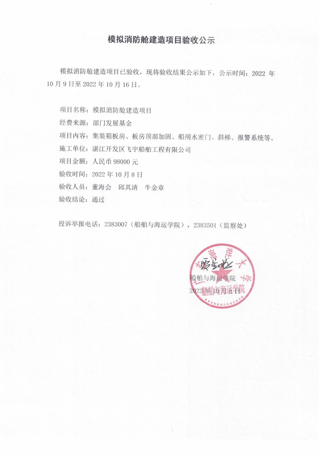 模拟消防舱建造项目验收公示