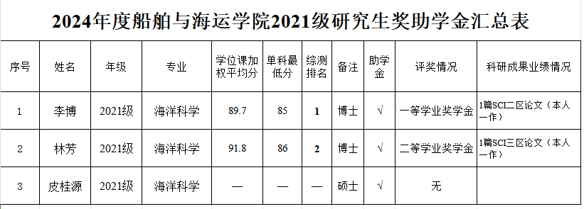 根据《广东省教育厅关于做好2024年秋季学期员工资助工作的通知》及《公司关于开展2024年研究生国家奖学金、学业奖学金和助学金评审工作的通知》精神,按照《sunbet申搏全日制研究生奖助学金实施办法》,经个人申请、公司评审小组认真审核及严格评选,拟确定获得研究生助学金、学业奖学金人员名单。其中,2021级海洋科学专业皮桂源同学因休学补发半年助学金,其余硕士研究生均不分等级全部获得助学金。现将评审名单进行公示(详见附表)。