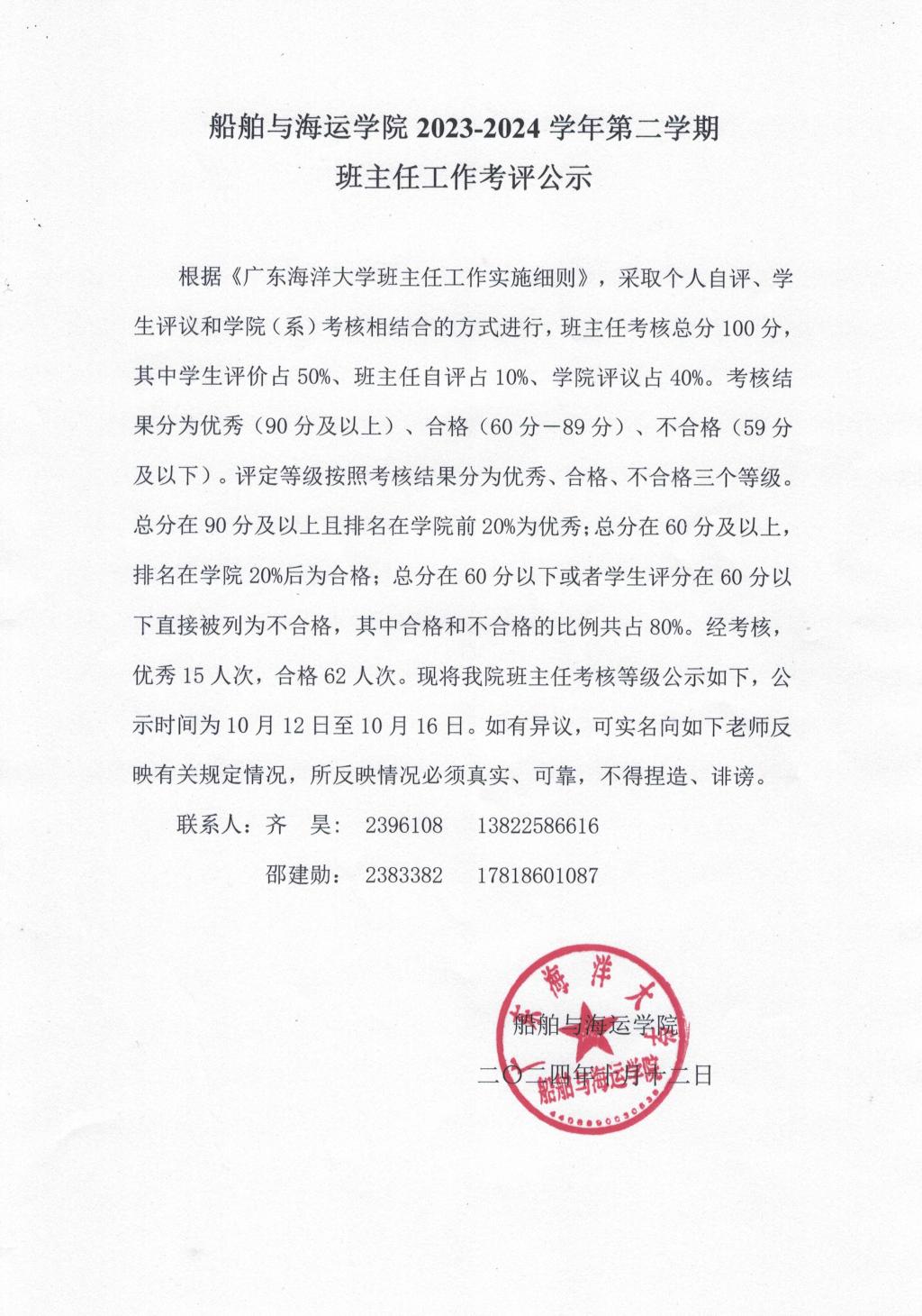 根据《sunbet申搏班主任工作实施细则》,采取个人自评、员工评议和公司(系)考核相结合的方式进行,班主任考核总分100分,其中员工评价占50%、班主任自评占10%、公司评议占40%。考核结果分为优秀(90分及以上)、合格(60分-89分)、不合格(59分及以下)。评定等级按照考核结果分为优秀、合格、不合格三个等级。总分在90分及以上且排名在公司前20%为优秀;总分在60分及以上,排名在公司20%后为合格;总分在60分以下或者员工评分在60分以下直接被列为不合格,其中合格和不合格的比例共占80%。经考核,优秀15人次,合格62人次。现将公司班主任考核等级公示如下,公示时间为10月12日至10月16日。如有异议,可实名向如下老师反映有关规定情况,所反映情况必须真实、可靠,不得捏造、诽谤。