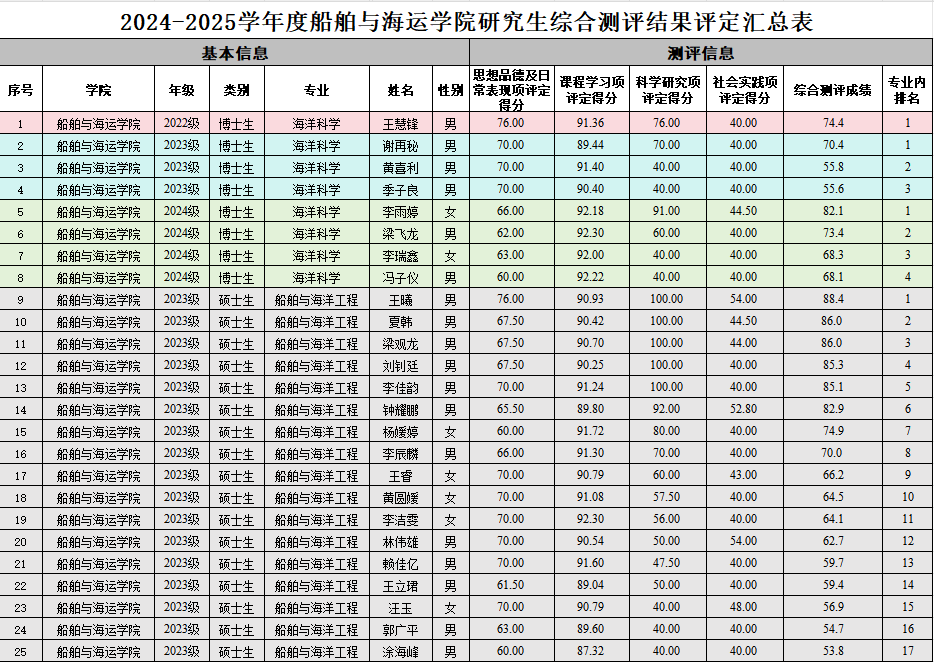 根据《关于做好2025学年全日制研究生素质综合测评及奖助学金评审工作的通知》(校员工〔2025〕37号)要求,按照《sunbet申搏研究生综合测评办法》(校研究生〔2020〕7号)执行,经个人自评、班级测评及公示、公司审核,现将sunbet申搏2024-2025学年度研究生综合测评结果公示如下: